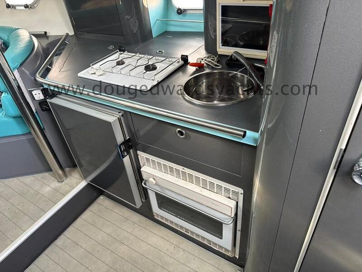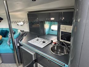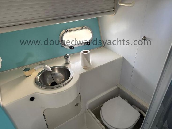The galley is to starboard and is equipped with:- twin burner gas hob, oven, stainless steel sink with hot/ cold pressurised water and a fridge. The enclosed heads compartment is to port and has a marine wc and a stainless steel basin with hot/ cold showerhead. There are twin double berth aft cabins.