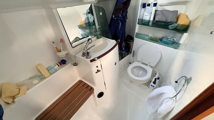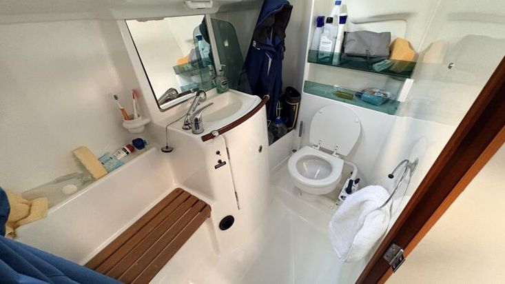 The large head compartment is to starboard and has a marine toilet c/w 85L holding tank, a hand basin with hot/cold water supply and a separate shower.
