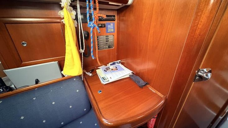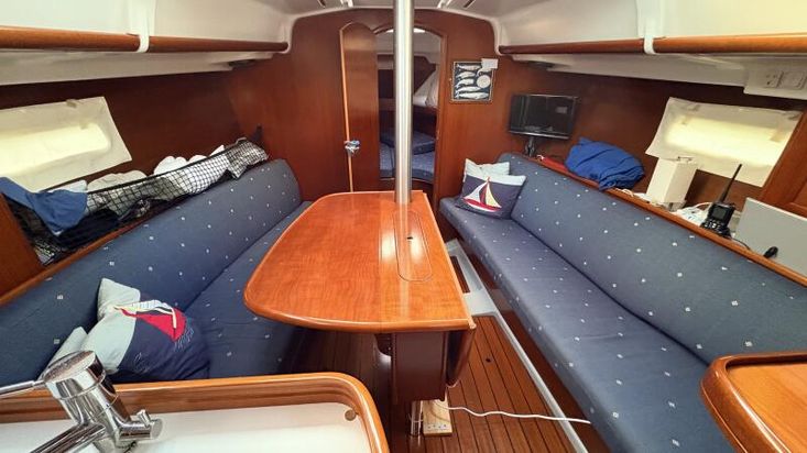 There are two single settee berths in the saloon either side of the polished wood dropleaf saloon table. There are storage lockers and quality varnished cabinetry throughout.