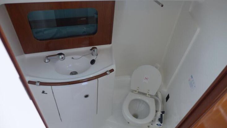 The heads compartment, located to starboard, includes a marine toilet, hand basin, and shower, with storage lockers and a wet hanging area.