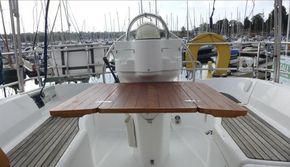 The Oceanis 331 features a spacious, well-protected aft cockpit with comfortable seating for family or crew. The wheel steering and aft swim platform with a fold-down ladder make for easy access to the water. All control lines are led aft to the cockpit for safe, short-handed sailing. Wide side decks, stainless steel guardrails, and grab handles provide safe movement around the deck.