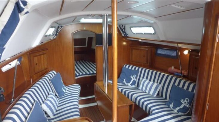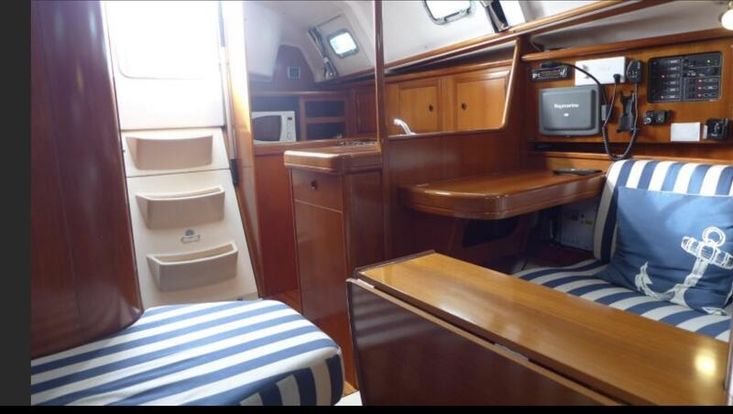 Below deck, the bright and airy saloon benefits from generous headroom and large deckhead windows, creating a warm and inviting atmosphere. A U-shaped dinette with a folding table sits to starboard, comfortably seating up to six, while a settee berth to port provides additional seating or an occasional berth. Ample storage is integrated behind and beneath the seating. Beautiful Blue and White stripped upholstery. Curtains.