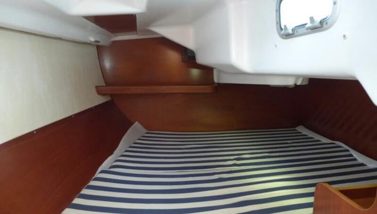 -Aft Cabin: A generous double berth tucked beneath the cockpit, with good headroom, hanging locker, and side shelving — ideal for guests or family.
