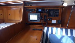 To port is the chart table and navigation area, featuring an electrical control panel, VHF, E80 Chartplotter and space for charts and instruments — perfectly positioned for ease of use at sea.